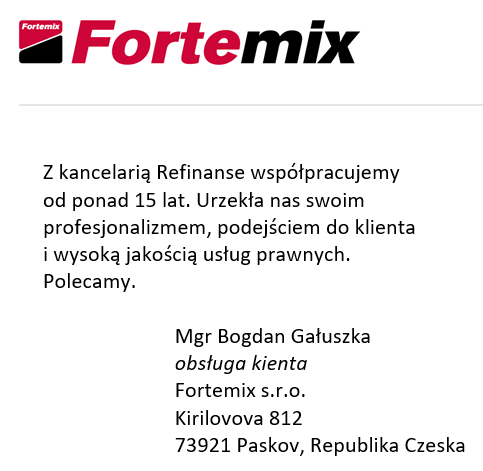 „Współpracujemy z Kancelarią Prawną REFINANSE w Bydgoszczy w zakresie obsługi prawnej od kilku lat. Z satysfakcją podkreślamy, że nasza współpraca układa się pomyślnie. Jesteśmy zadowoleni z kompleksowej i sprawnej obsługi. Jest to firma godna zaufania i polecenia jako uczciwy i rzetelny partner.”